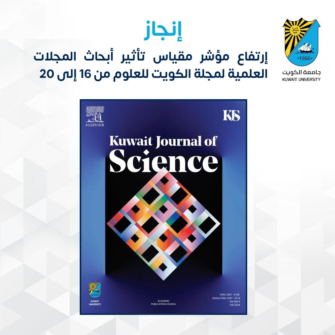 هنأ القائم بأعمال نائب مدير الجامعة للأبحاث د. ناصر التناك رئيسة تحرير مجلة الكويت للعلوم أ.د. شفيقة عبدالحميد العوضي على زيادة مؤشر مقياس تأثير أبحاث المجلات العلمية (H-index) من 16 إلى 20، وارتفاع عامل الاستشهاد (Cite Score) من 1.6 إلى 2.1 وفقاً لقاعدة بيانات "سكوبس" (Scopus).