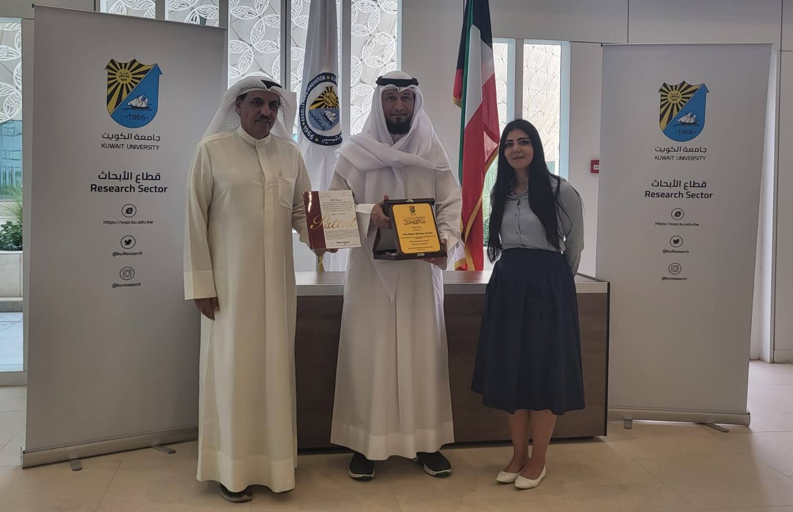 وفي هذا السياق ، تقدم القائم بأعمال نائب مدير الجامعة للأبحاث أ.د. عثمان الخضر بالتهاني والتبريكات للمخترع أ.د. بدر العنزي لحصولة على براءة اختراع جديدة تسجل لجامعة الكويت .