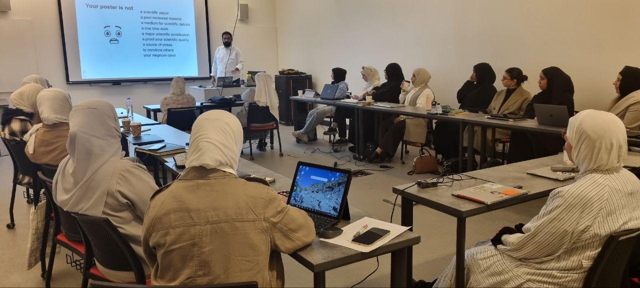 نظم مكتب التعاون البحثي الخارجي والاستشارات في قطاع الأبحاث ورشة عمل بعنوان :" تصميم الملصق البحثي: نظرة فنية للتواصل الأكاديمي "، للباحثين من أعضاء الهيئة الأكاديمية وطلبة الدراسات العليا في يوم الأربعاء الموافق 29 نوفمبر 2023، وقدمها د. حسن الحداد من كلية العلوم، قسم العلوم البيولوجية، وذلك في كلية العلوم بمدينة صباح السالم الجامعية في الشدادية.