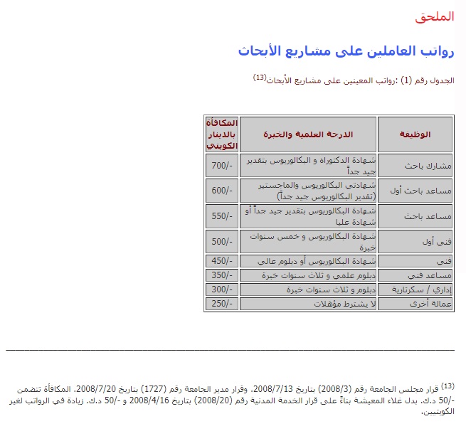 - في حال مشاريع الأبحاث التي يتعدد فيها الباحثون ممن تنطبق عليهم (رقم 1 ) أعلاه فإن الباحث الرئيس يحصل على مكافأة مالية لا تتعدى نصف المكافأة المذكورة أعلاه ويوزع باقي المبلغ بالتساوي على الباحثين المشاركين من جامعة الكويت لنفس المشروع.