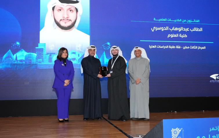 Prof. Al-Jallal thanked Kuwait University President, Prof. Dina Al-Mailem, the Assistant Vice President for Research and Chairman of the Organizing Committee, Dr. Mabkhout Al-Dousari, and the entire team at the Research Sector. He complemented their excellent work in demonstrating KU's pioneering role in embedding a culture of inquiry and innovation, and in empowering national talents to play an active part in the overall development journey, in alignment with Kuwait's future vision.